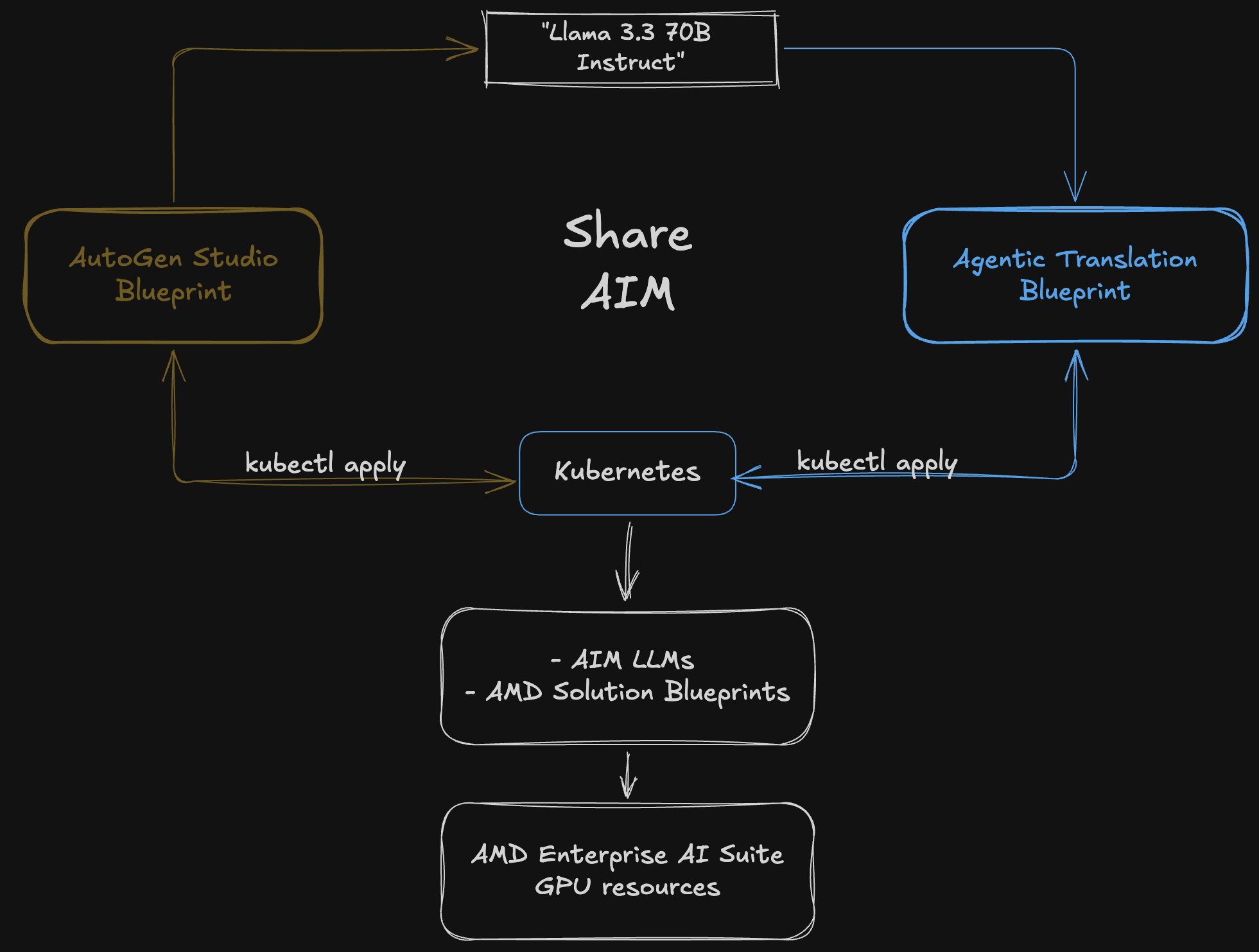 In this section, we deploy two Solution Blueprints that will share a single AIM LLM. We start by deploying the AutoGen Studio blueprint directly from the terminal using kubectl apply. Each Solution Blueprint ships with a default AIM LLM (Llama 3.3 70B Instruct). Rather than deploying a separate model for each blueprint, we then deploy the Agentic Translation blueprint and connect it to the same AIM, sharing a single LLM across both blueprints. The resulting architecture is shown in Figure 1, below: