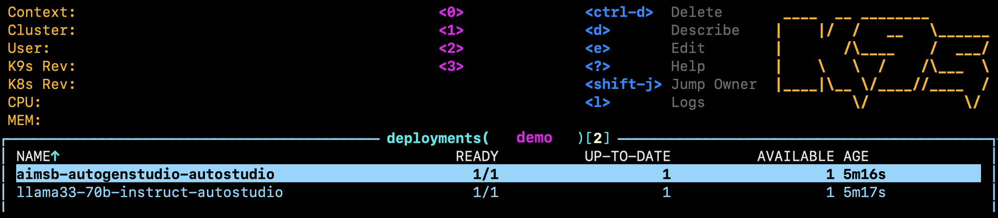 Figure 3: The two resulting deployments visible in k9s - the Solution Blueprint app (top) and the AIM LLM serving Llama 3.3 70B Instruct (bottom).