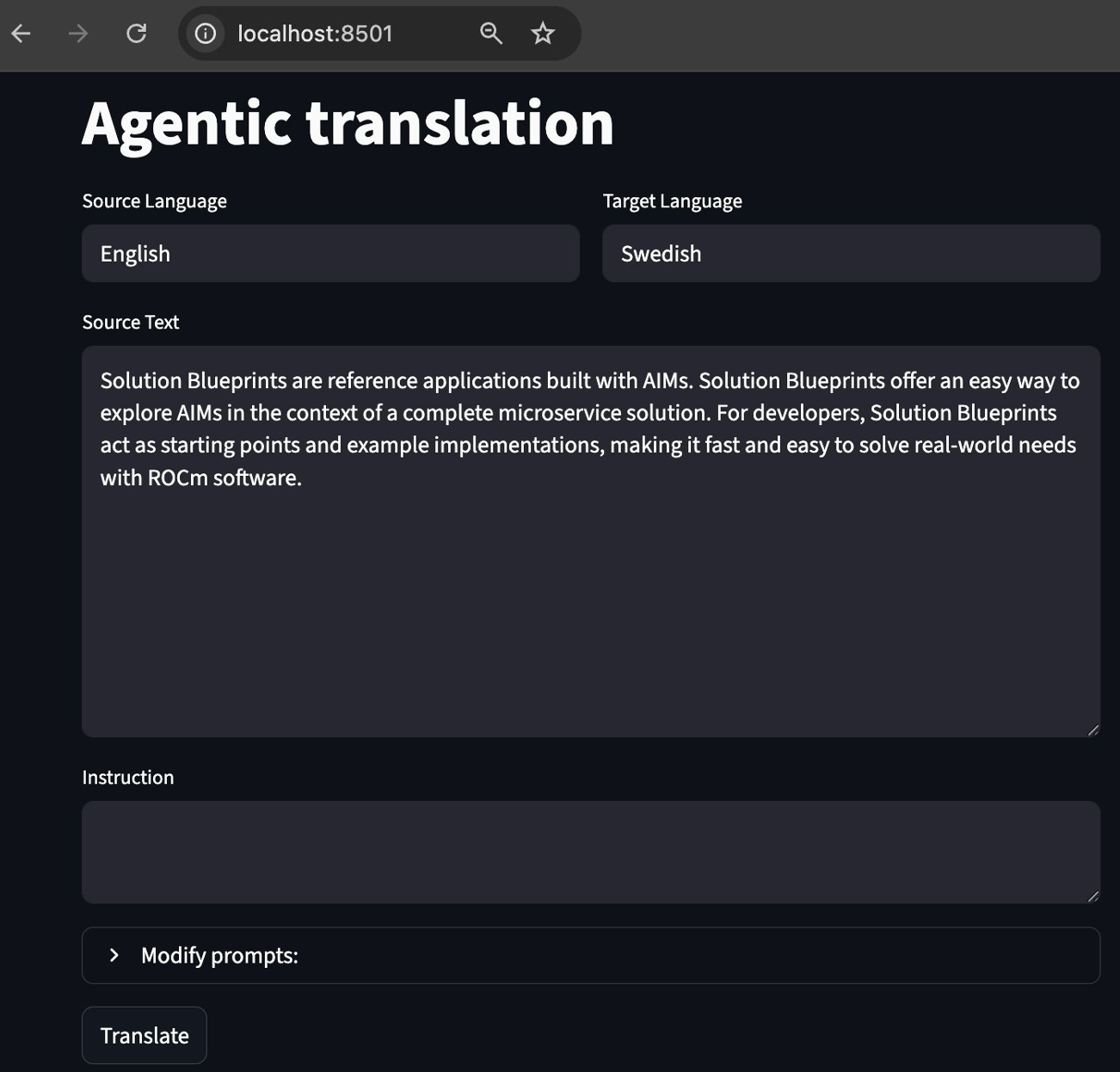 Feel free to explore the UI and test the translation capabilities with different inputs and instructions.