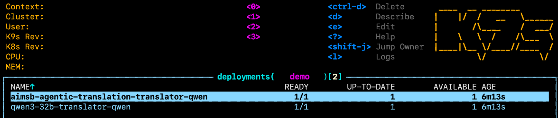 Figure 6: Deployments in k9s - the AIM now runs Qwen3-32B instead of Llama 3.3 70B Instruct.