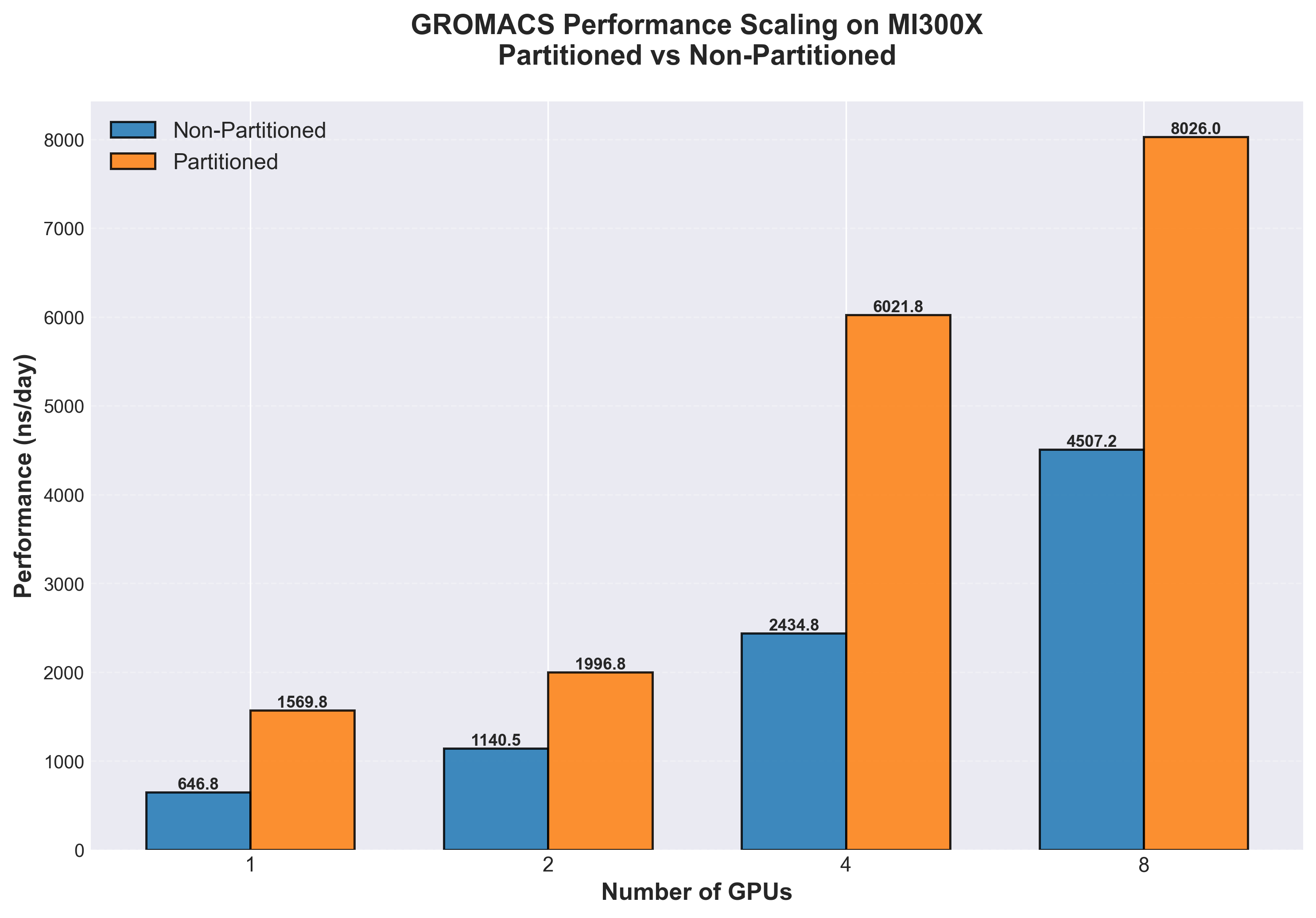 Figure 1. Simulation throughput (ns/day, higher is better) comparison of GROMACS multidir runs on MI300X, non-partitioned (blue) vs. partitioned (orange) for 1, 2, 4 and 8 GPUs respectively