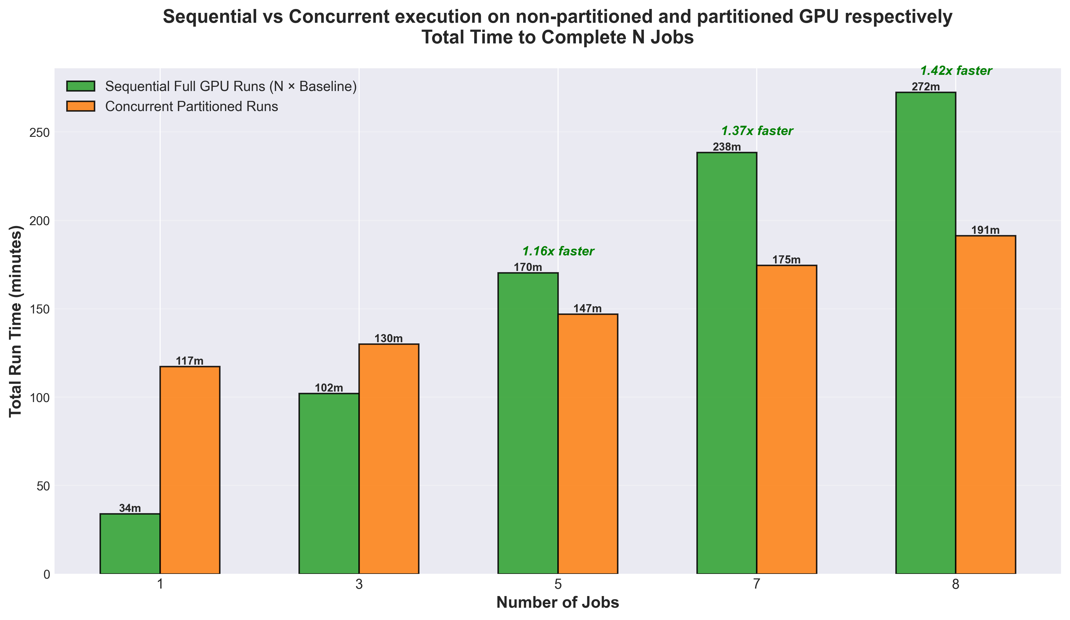 Figure 2. Comparison of sequential full GPU execution versus concurrent partitioned runs for REINVENT4 on MI300X. The graph shows the total time required to complete N jobs using two different approaches: running them sequentially on a full MI300X GPU (green bars) versus running them concurrently on XCD partitions (orange bars).