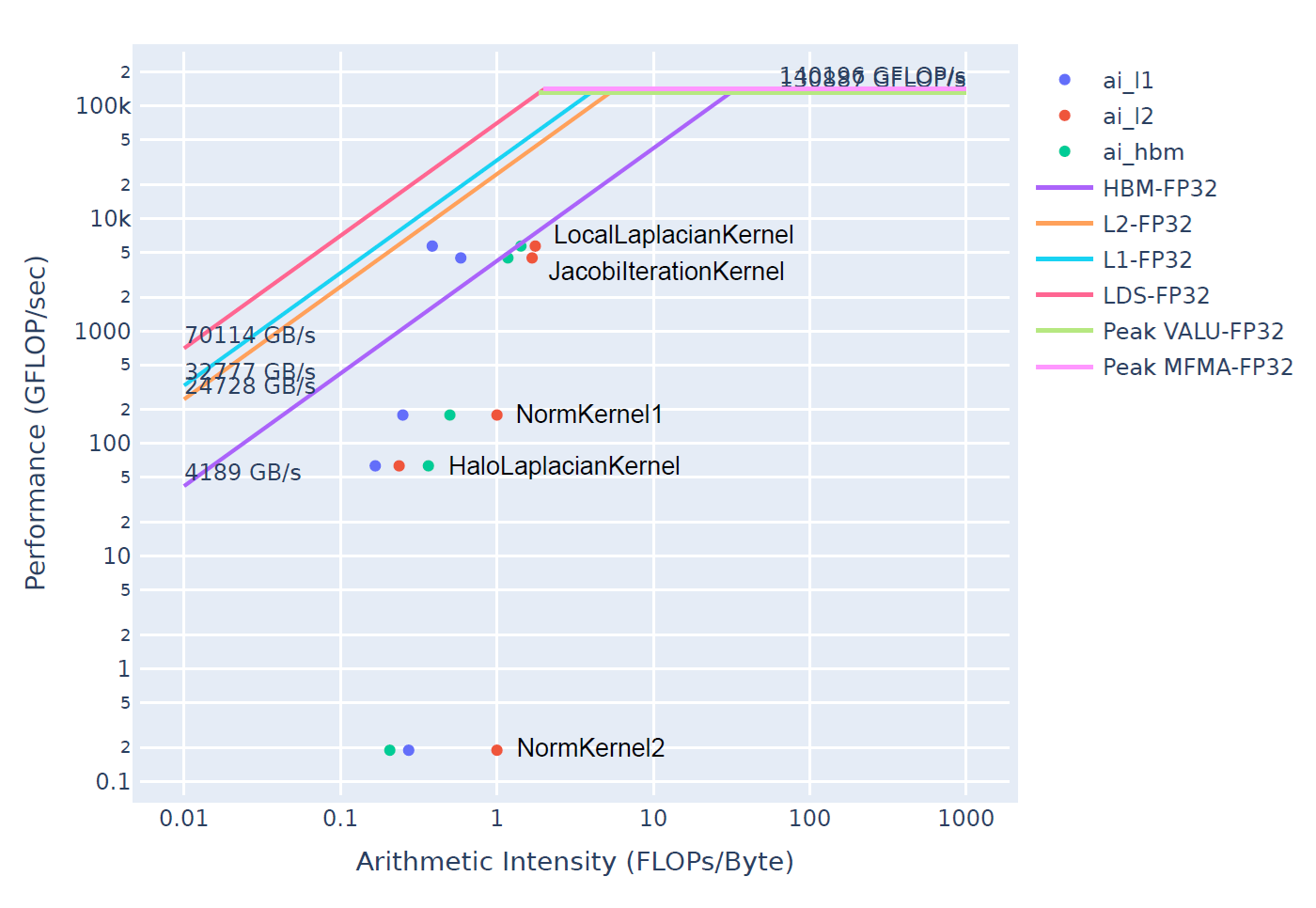 The roofline analysis in Figures 4 and 5 reveals that NormKernel1 achieved the most substantial performance improvement. Examining the High-Bandwidth Memory (HBM) roofline, the highest-level cache hierarchy, shows that the optimized kernel operates much closer to the theoretical performance ceiling, though optimization potential remains. With a block size of 1024 threads (as demonstrated in the reference blog), NormKernel1 would align directly with the HBM roofline, indicating optimal memory bandwidth saturation. While HaloLaplacianKernel and NormKernel2 remain distant from the roofline curve, their minimal contribution to total execution time makes them lower-priority optimization targets.