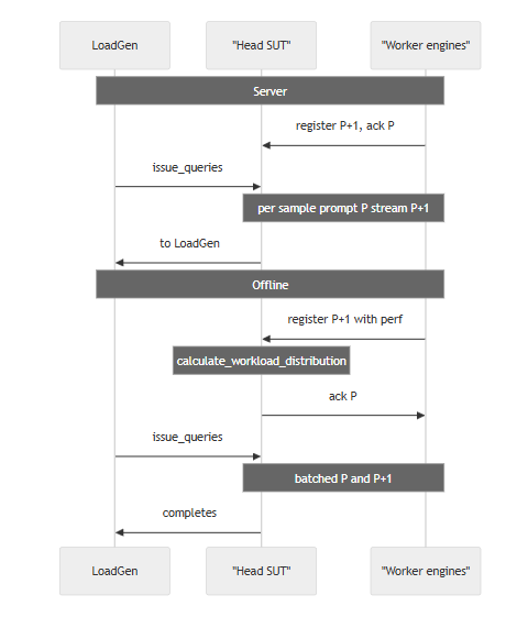 The figure below shows the operational flow for both Offline and Server scenarios. In the server scenario, after the cluster is configured, policy-based query distribution to worker nodes happens. This can be round robin, shortest load queue, or another distribution method. In the offline scenario, calculate_workload_distribution determines how the queries from the MLPerf Loadgen are distributed across the worker nodes. This is policy based. It can be based on the GPU capabilities, equal distribution, weighted distribution, or another policy.