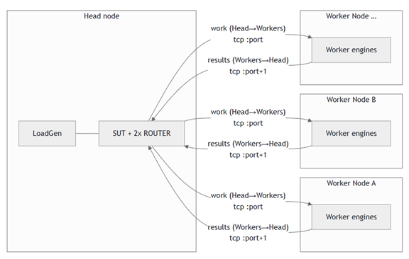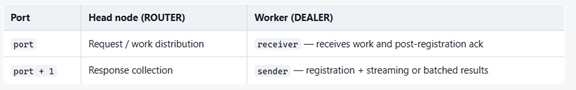 The GPU engine on each Worker node runs a worker process that connects to the Head node’s IP over TCP using ZeroMQ (ZMQ). Each engine uses two logical TCP channels to communicate work and results to the Head node. The figure below shows the socket usage between the Head node and the Worker nodes.