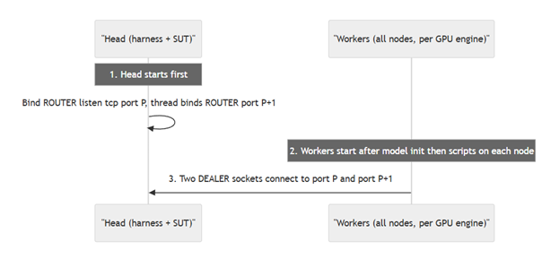 One node in the cluster was designated to be the Head node. The Head node acted as the orchestrator for interfacing with the MLPerf LoadGen. The remainder of the nodes in the cluster were designated to be Worker nodes for workload scheduling/management. The figure below shows the multi-node topology (Logical View) with the Head node running the MLPerf harness and drives the Worker nodes. The Head node also runs a local SUT.