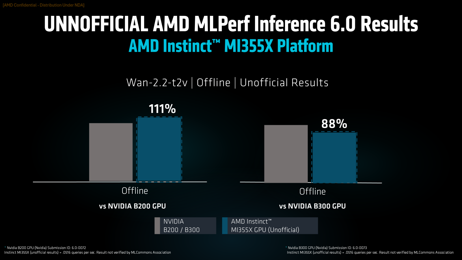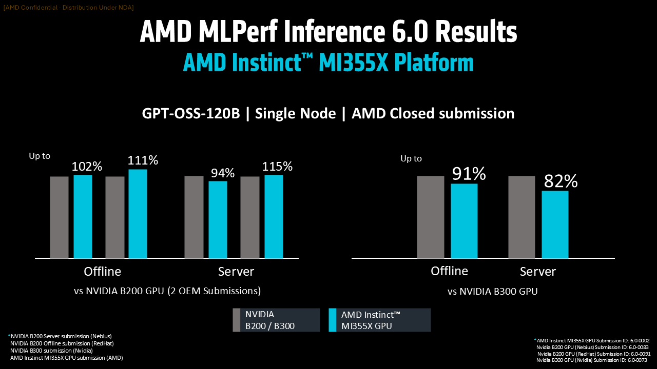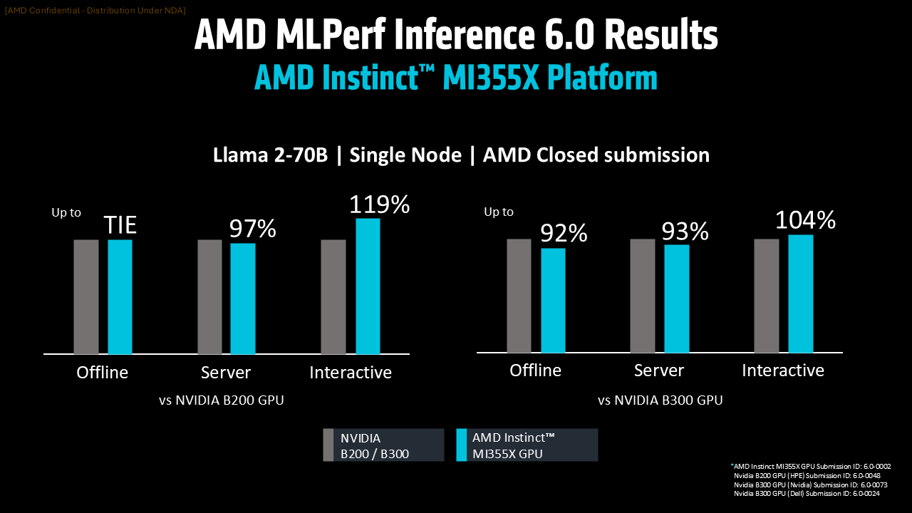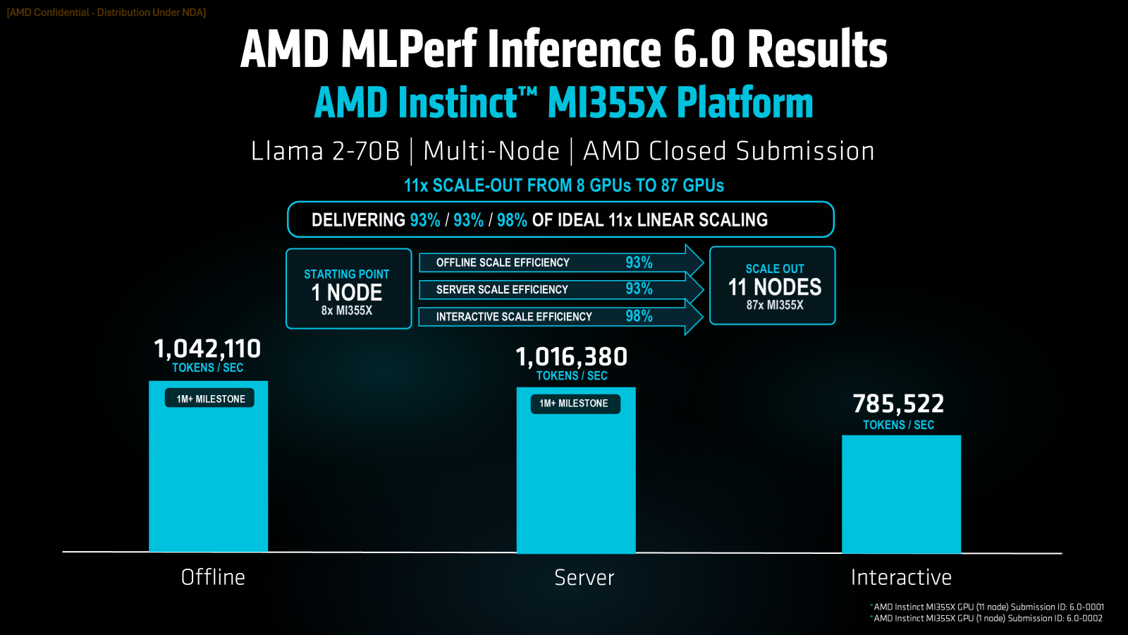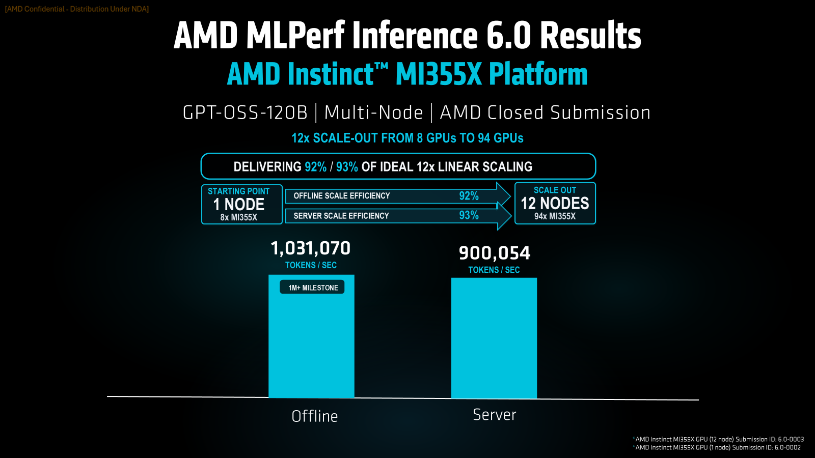 MLPerf v6.0 featured the first AMD Multi-Node MI355X submission. It was the first ever MLPerf submission with over a million tokens/sec for Llama 2 70B (11-nodes) and gpt-oss-120b (12-nodes) in the Closed division.