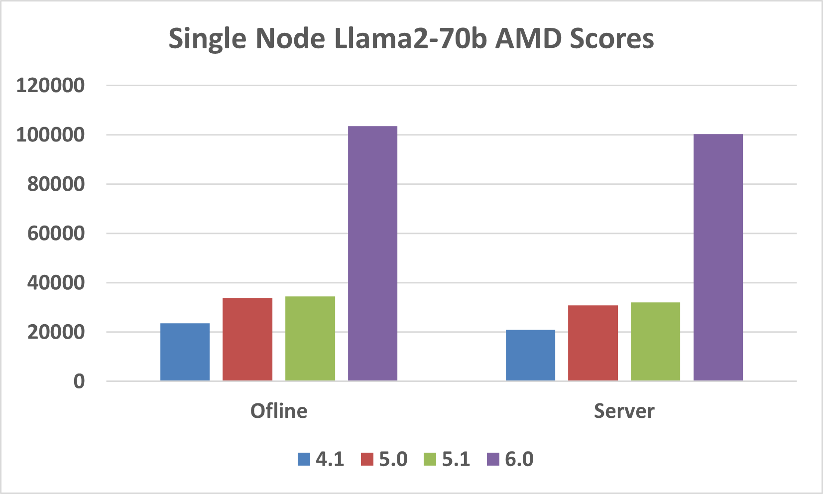MLPerf Inference v6.0 marks the fourth time that AMD submitted the Llama2-70b benchmark. The current round of submissions show a large performance improvement relative to previous rounds as illustrated in the figure below. Offline scores improved by 4.4x and Server scores improved by 4.8x. This was mainly due to FP4 quantization in the MI355X GPU.
