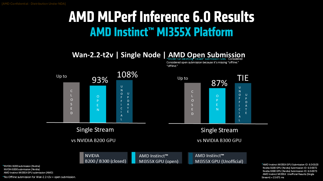 To show that Instinct GPUs could handle generative AI workloads outside of LLMs, AMD submitted scores for the Wan-2.2-t2v text-to-video workload (see figure below).
