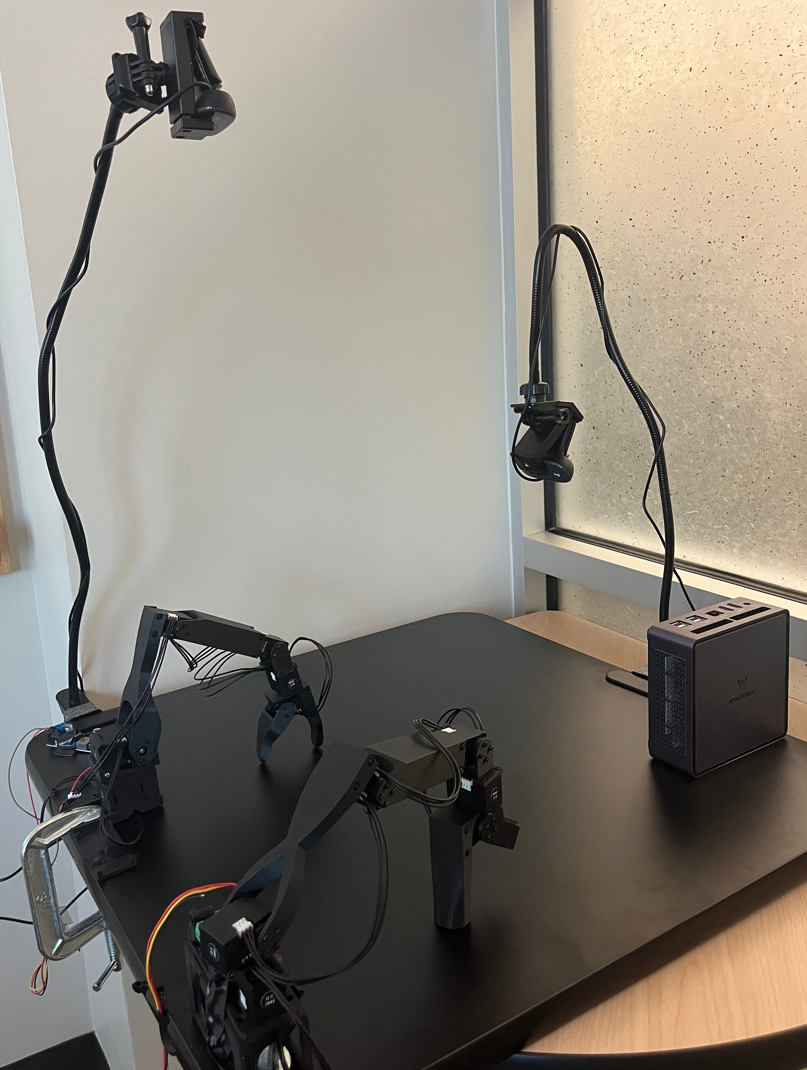 Figure 1. Our robotics setup features dual Koch robotic arms with leader-follower configuration, dual camera system for visual observation, and AMD Phoenix AI PC for real-time inference
