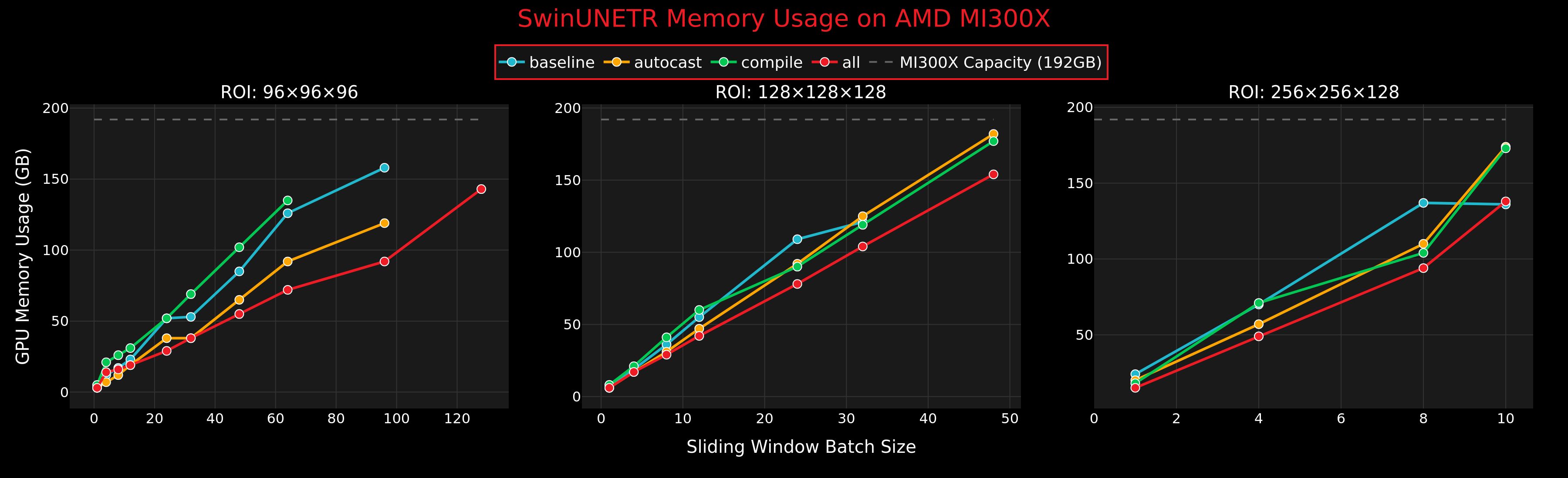 Figure 1. GPU memory usage vs sliding window batch size for SwinUNETR on AMD MI300X across three ROI sizes. The gray dashed line at 192GB indicates MI300X memory capacity.#
