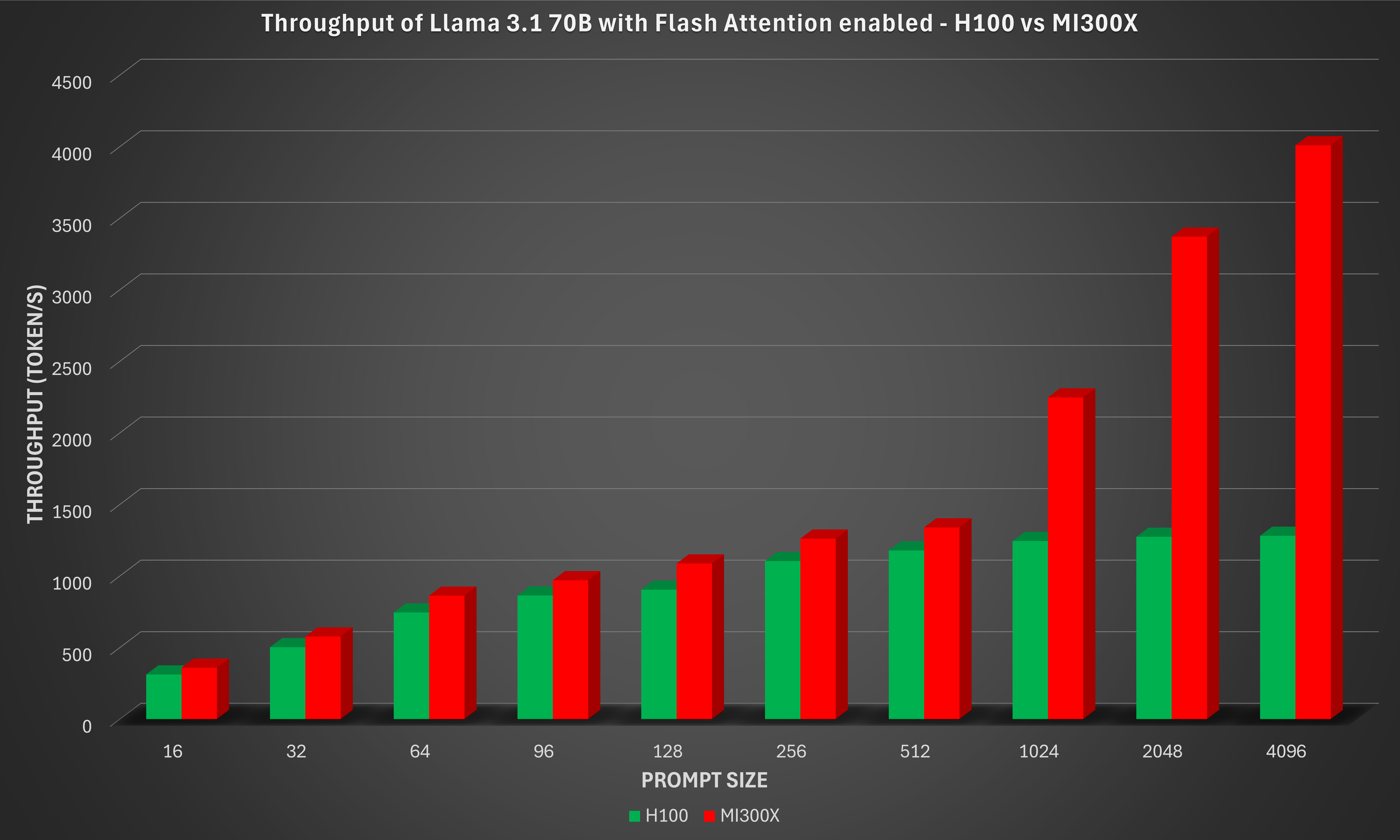The AMD Instinct MI300X 8x GPU offers up to 213% higher inference throughput vs. NVIDIA H100 on Meta-Llama-3.1-70B-Instruct-Q4_K_M when flash attention is enabled with a prompt size of 4096.