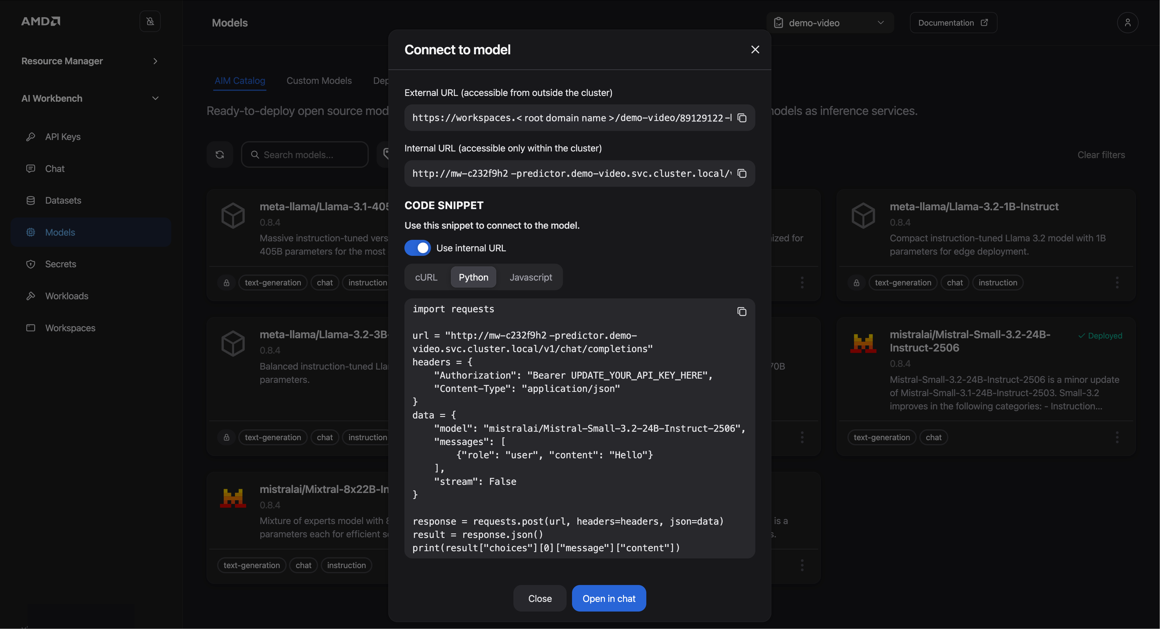 API Integration: Programmatically access the model using the AIM’s OpenAI‑compatible API endpoint