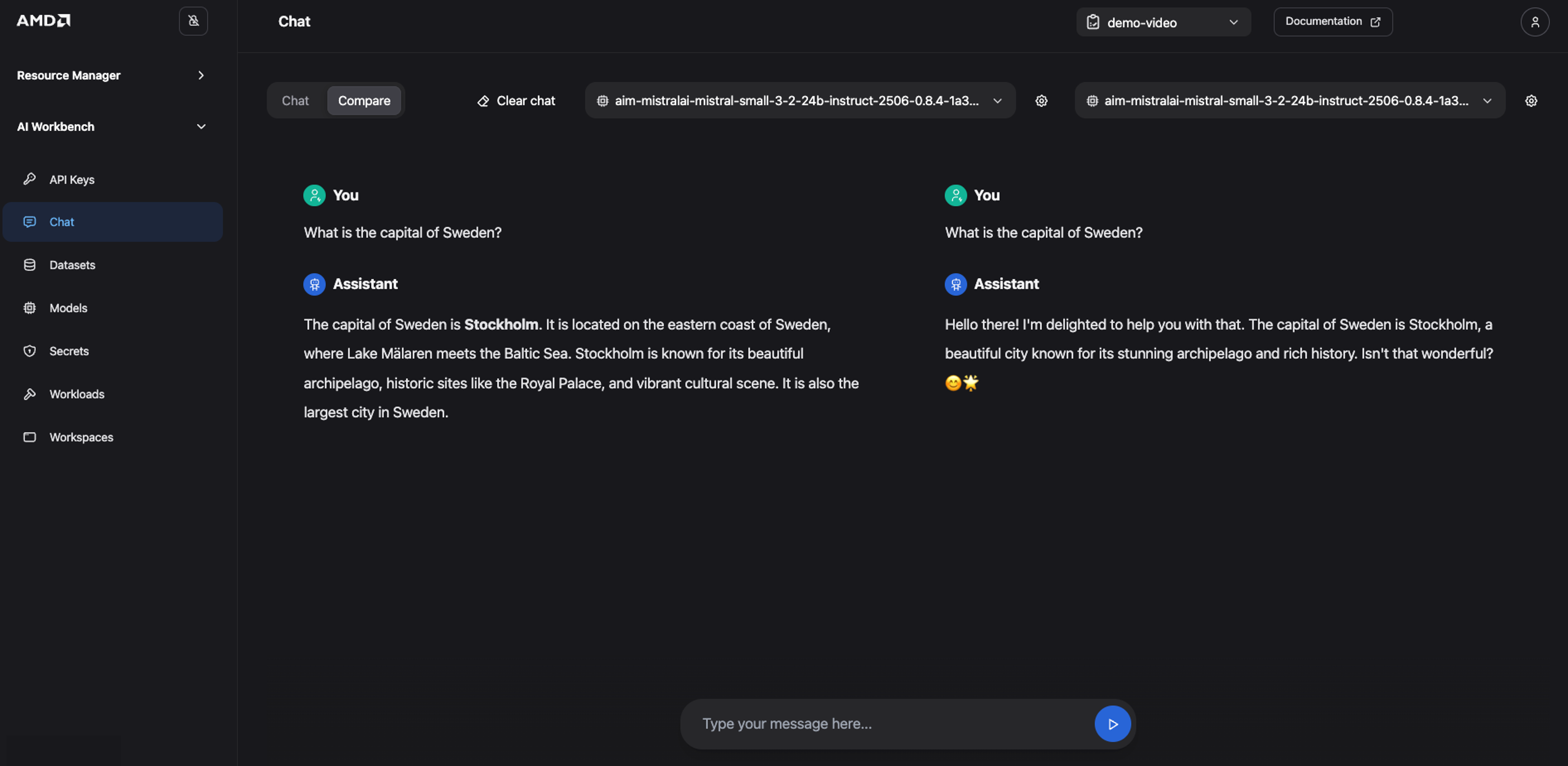 The Chat interface also includes a Compare mode. This feature sends the same prompt to two models (or the same model with different settings) and displays their responses side‑by‑side, making it easy to evaluate differences in responses, accuracy, tone, and reasoning. Typical use cases include comparing a base model against its fine-tuned version or testing how different system prompts and generation parameters affect a single model’s behavior.