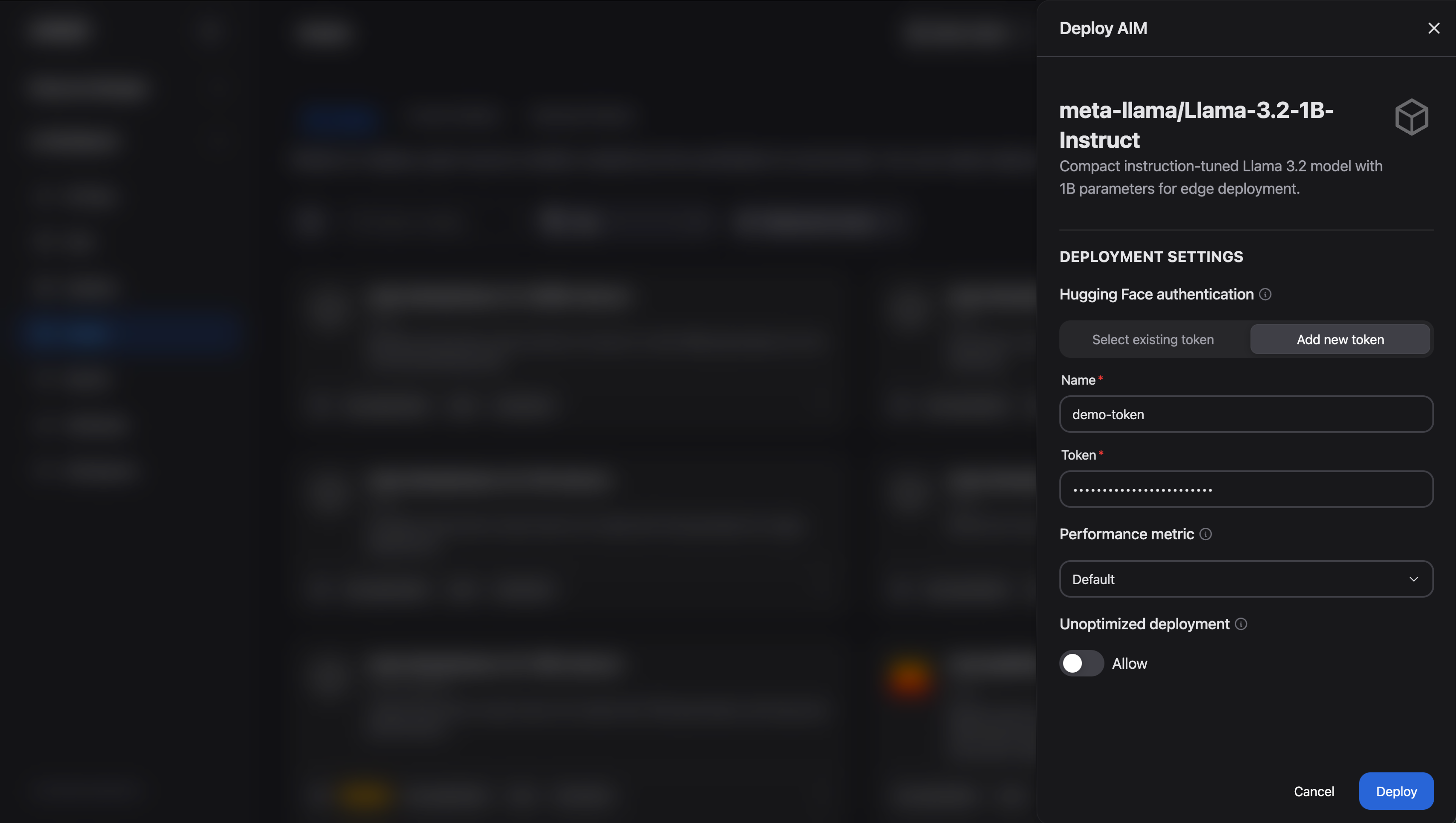 The model used in this example is public and does not require a Hugging Face token. However, if you wish to deploy a gated model (such as those from the Llama family), which is indicated by a lock icon on its model card, you must provide a Hugging Face token for access. Adding a token is straightforward: