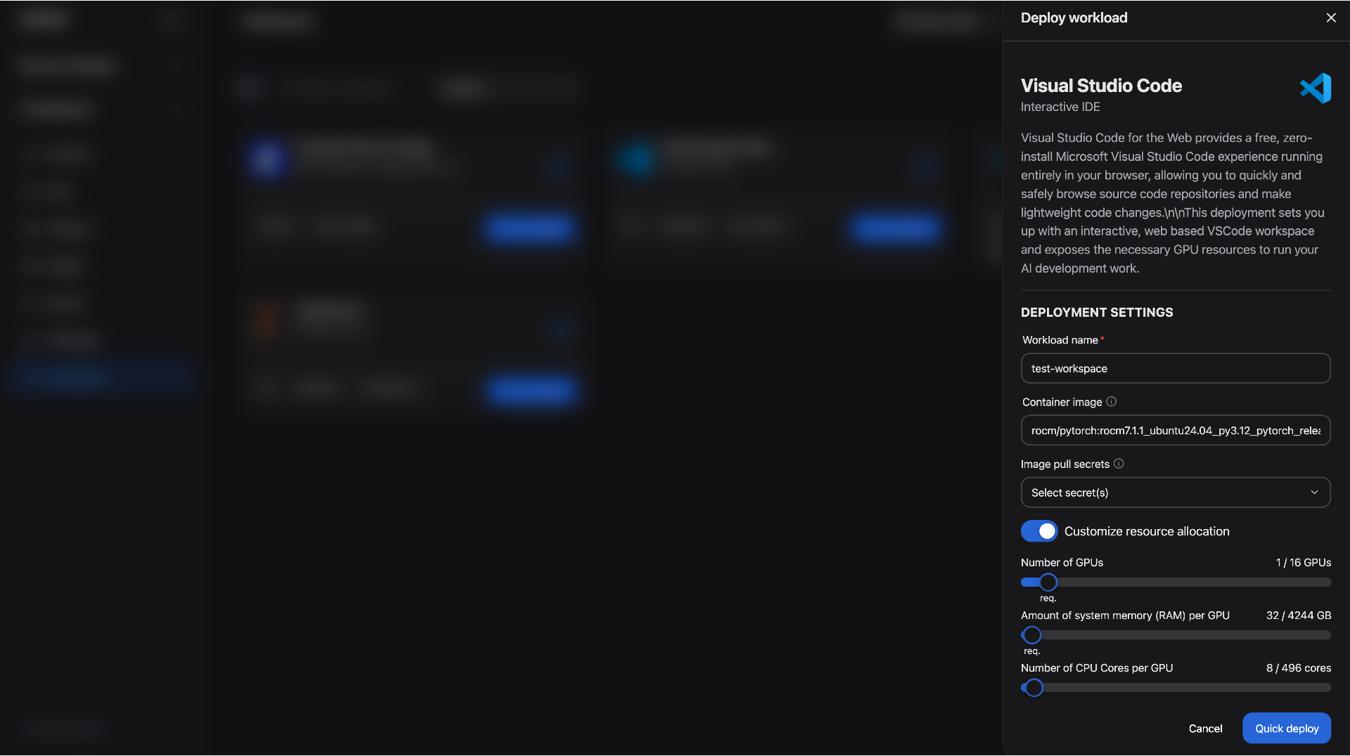 Locate the VS Code card and click View and deploy. This will open the deployment configuration view where you can customize your workspace before deployment (See Figure 7).