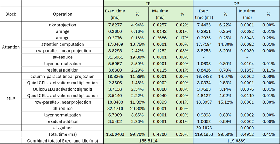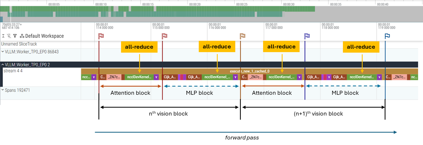 TP mode: 63 synchronization points of all-reduce are found in each attention and MLP blocks of the vision transformer to aggregate partial results across TP ranks